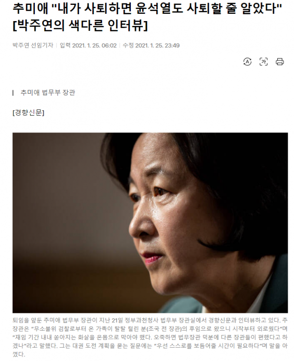 하지만 추 전 장관은 지난 2021년 1월 25일 경향신문과의 인터뷰를 통해 당시 법무장관의 사임은 자의적인 것이며, 당시 윤석열 검찰총장의 동반사임을 의도한 것이었다고 밝힌 바 있다.