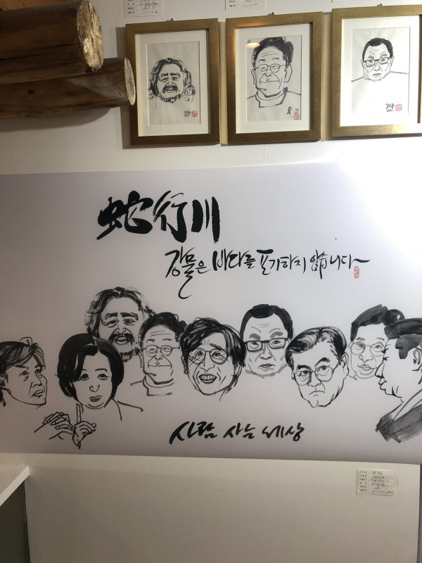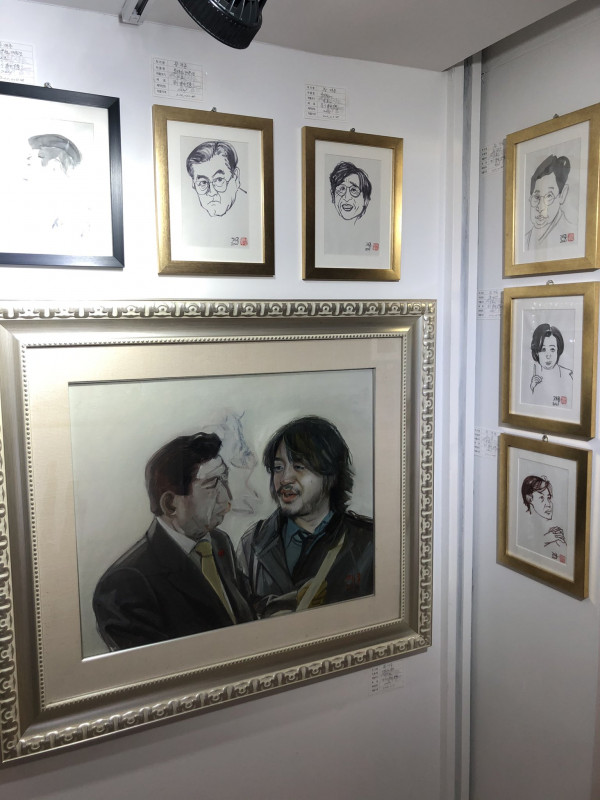 이재명 경기도 시자의 그림이 가운데에 배치되어 있고, 왼쪽에는 김어준씨, 오른쪽에는 이해찬 전 더불어민주당 당대표가 배치되어 있다. 몇몇 SNS 사용자들은 이같은 배치 자체가 의도성이 있는 것으로 의심하고 있다. 이들은 김어준씨와 이해찬 전 당대표가 사실상 친 이재명 인사임을 들어, 이러한 배치가 이재명 지사를 올리세우기 위한 것이라 주장하고 있다. 노무현 대통령을 기리기 위한 전시회에 이재명 경기도 지사를 중심으로 한 이같은 작품배치는 전시회의 취지와 맞지 않는다는 설명이다. 이에 대한 판단 역시 독자들의 몫으로 한다.[사진=트위캡처]