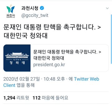 지난 27일 오후 10시 48분경 과천시는 트윗계정을 통해 '<문재인 대통령의 탄핵을 촉구합니다>대한민국 청와대'라는 트윗글을 올렸다. 아울러 국민청원에 올라온 대통령 탄핵청원을 링크해 내티즌들의 분노를 자아냈다.