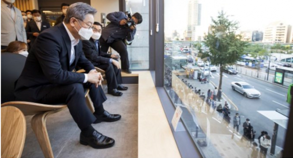경기도가 사당역에 설치한 경기버스 라운지에 대한 무용론과 혈세 낭비론 주장이 나오고 있는 가운데, 지난 6일 경기도 지사가 버스 라운지에서 버스 정류장에 길게 늘어서 버스를 기다리는 이용자들을 바라보고 있다. 사진을 본 일부 인터넷 누리꾼들은 라운지의 효용성에 대해 회의적인 시각을 표출하기도 했다. [사진]=경기도 제공