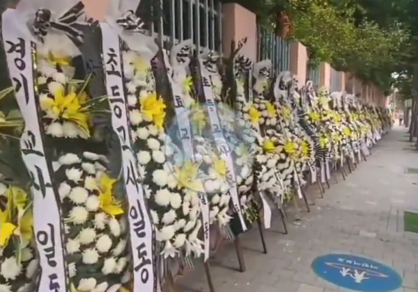 [사진=인터넷 트윗 캡처, 20일 아침 해당 초등학교 주변에 조화들이 속속 들어서고 있다]