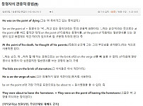 He was on the point of dying.(그는 막 죽어가고 있는 중이었다.) ‘be on the point of + 동명사’는 ‘막 ...하고 있는 중이다’라는 뜻의 …