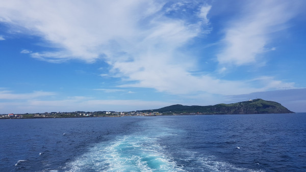 갑판 위에서 주변 풍경을 보고 있는데 갑자기 선미 쪽에서 사람들이 ‘와’ 하는 함성이 들렸다. 선미 쪽으로 급히 가보니 성산항 방조제 앞바다에서 돌고래 몇 마리가 지나가고 있었다. 먼 거리여서 돌고래 몸통은 볼 수 없고 꼬리만 볼 수 있었다.