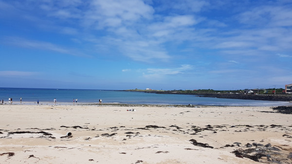 분명 올레 리본을 따라 걸어왔지만 어떤 연유인지 모르겠지만 올레길 서쪽에 있는 홍조단과해변과 하우목동항을 경유하지 않고 들판을 가로질러 동쪽 해변인 하고수동 해수욕장으로 바로 와버렸다. 들판 길에서 올레 리본을 잃어버려 한참을 헤맨 터라 다시 돌아가지 않았다. 하고수동 해수욕장은 크지 않았지만 하얀 모래사장에 비취색을 띠고 있어 멀리서 보기에 아름다웠다. 아직 본격 여름철이 아니지만 더운 날씨에 모래사장에서 거닐고 있는 사람들을 볼 수 있었다.