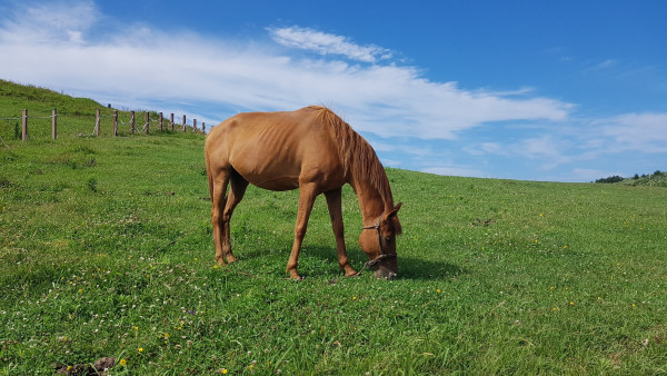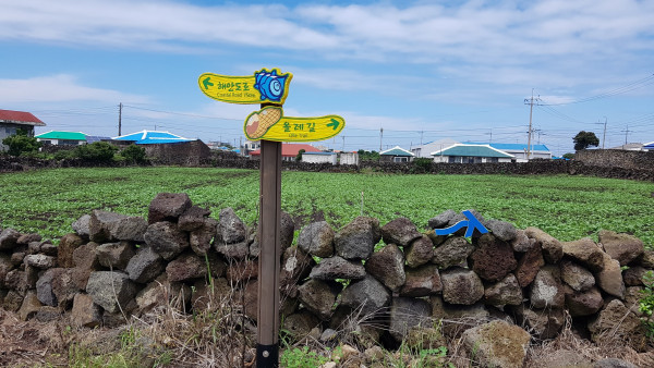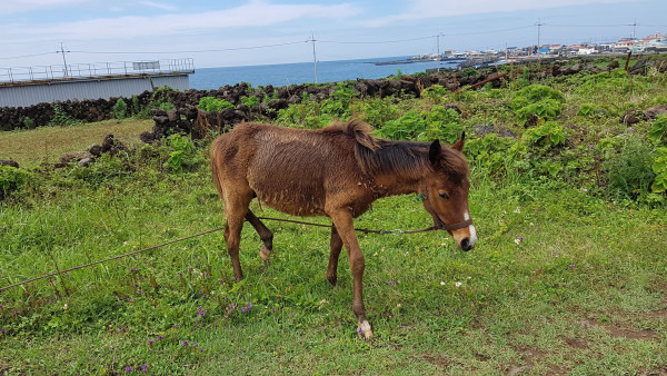 올레길은 해안 도로가 아닌 섬 안쪽으로 들어갔다. 해안 도로가 일반 차량 ․ 전동 스쿠터 ․ 자전거를 타는 관광객들로 몰려 올레길을 안쪽으로 낸 것 같다. 안쪽 들판 길은 관광객이 없어 좋았지만, 말똥이 지천으로 깔려 있어 발을 잘 내디뎌야 했다. 들판 여기저기에는 말들이 평화롭게 풀을 뜯어 먹고 있었다.