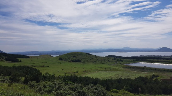 우도봉 정상에 올라 우도 전체를 바라보니 우도봉 바로 아래 저수지가 있었고 여기저기 푸른 초원과 돌담으로 둘러싸인 밭이 보였다. 우도도 제주 본섬처럼 자체 생활 기반을 갖춘 독립 섬이라는 생각이 확실히 들었다.