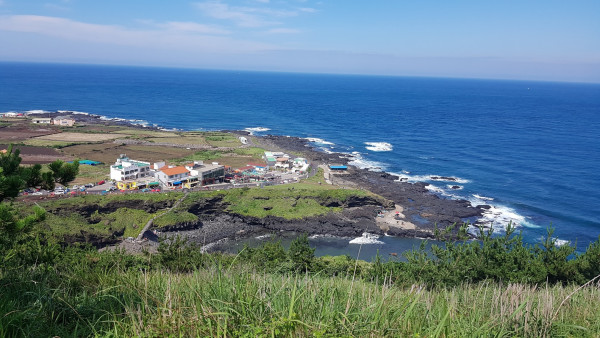 능선 오르는 길 왼쪽 바다 쪽은 절벽을 이루고 해수가 만난 아래쪽에는 제주에서 쉽게 만날 수 있는 대표적 화산 지형인 코지와 해안동굴이 형성되어 있다. 검은 현무암 절벽이 바다로 내리지른데다 바다색마저 짙은 푸른 색깔이어서 긴장감마저 들었다.