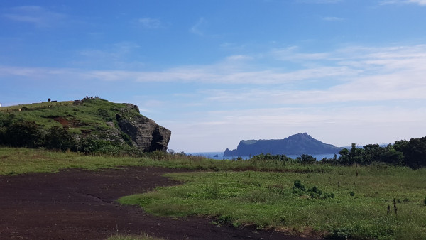 구릉 지역에서 내려오다 보니 성산 일출봉이 보였다. 우도에서 보는 성산 일출봉은 제주에서 바라본 느낌과 달랐다. 일출봉은 제주에서 벗어나 홀로 서 있지만, 왕관을 쓴 왕자처럼 늠름한 모습이다. 지난번 1코스를 걸을 때 일출봉을 왼쪽에서 오른쪽으로 볼 수 있었으나 이번에는 뒤편에서 일출봉의 늠름한 자태를 보니 행복한 느낌을 지울 수 없었다.