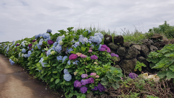 마을 돌담길 양쪽에 하얀색과 보라색 수국꽃이 소담스럽게 피어 있었다. 그러고 보니 6월 제주의 꽃은 수국이다. 봄에는 유채꽃과 무꽃이, 초여름에는 수국꽃이 제주 들판을 수놓고 있었다.