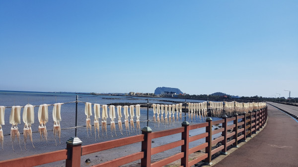 종달리 해안도로 올레길을 걸으니 도로 갑판 위로 한치를 말리고 있었다. 1코스 중간 점인 목화휴게소에서는 건조된 한치를 팔고 있었다.
