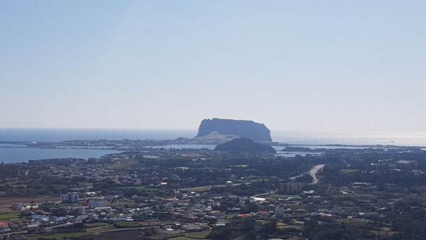 올레길은 성산일출봉을 향해 언덕으로 향한다. 언덕에 올라서자 멋진 풍광이 우리 앞에 나타났다. 푸른 바다에 접해 있는 성산일출봉이 위풍당당하게 모습을 드러냈다. 그러나 일출봉 앞에 대형 리조트가 들어서 있어 전체 조망을 가리고 있어 아쉬웠다.