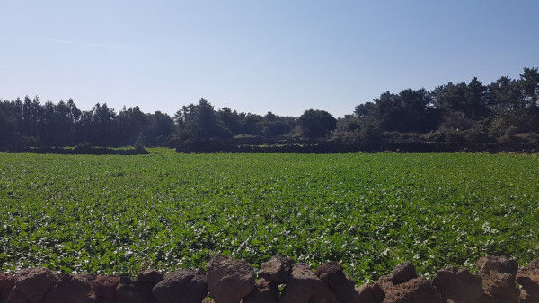 말미 오름으로 가는 올레길에는 돌담에 둘러싸여 있는 녹색 밭이 펼쳐져 있었다. 녹색의 무밭은 노란색의 유채밭과 함께 나에게 제주의 봄날을 상징하는 색으로 각인되었다.