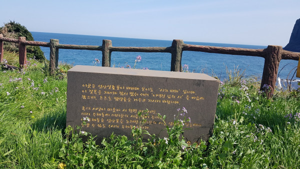 리조트를 빠져나오자 길 한쪽에 시비들이 보였다. 『그리운 바다 성산포 』등 제주 섬과 관련한 시작품을 남긴 충남 서산 출신의 이생진 시인을 기념하여 성산일출봉에 가는 거리에 그의 시들이 검은 돌판 위에 새겨져 있었다.