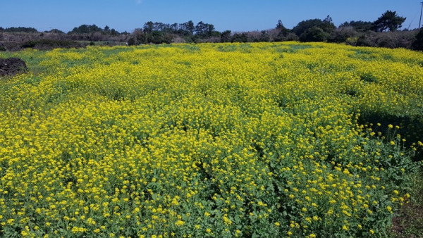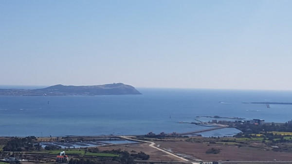 오름 아래 뭍에는 녹색 무밭과 노란 유채밭. 검은 돌이 조각보처럼 펼쳐져 있었다. 성산일출봉과 우도 사이 바다 색깔은 푸른 하늘을 배경으로 더욱 파랗게 보였다. 성산일출봉과 우도는 모두 육지에서 떨어져 나왔지만, 일출봉은 우뚝 서 있고 우도는 눕혀져 있다.