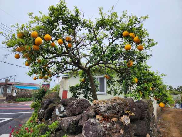 올레길은 좌기동 민가를 지나면서 민가 사이에 넓은 마늘밭을 만난다. 민가 돌담 사이 귤나무에는 큰 귤이 열려 있다. 어제 서귀포에서 남원으로 가는 길에 큰 귤이 열린 귤나무가 가로수처럼 늘어서 있는 것을 볼 수 있었다. 귤나무가 관상용으로 활용되는 것은 제주에서만 볼 수 있는 이색적인 풍경이다.