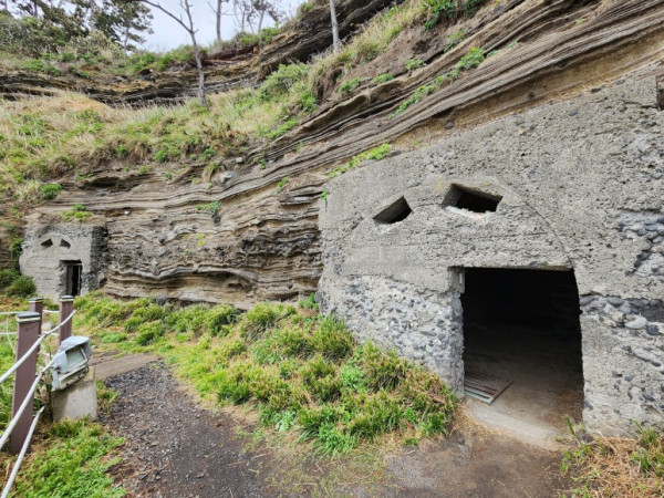 엉알길 절벽 한가운데 일본군 갱도 진지가 볼썽사납게 조성되어 있다. 지질학적으로 높은 가치가 있고 태곳적 모습을 간직하고 있는 이곳에 시멘트 진지를 구축한 일본군의 만행에 치가 떨렸다.