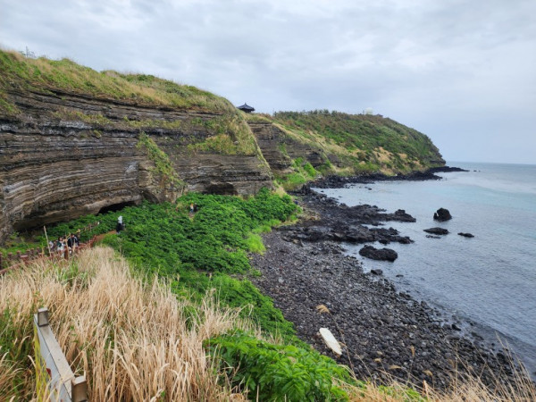 정자에서 쉴 틈 없이 수월봉에서 해변으로 내려오니 올레길은 해안가 지질 트레일 지역으로 이어진다. 해안가에서 보니 수월봉 일대는 오래전에 화산이 폭발할 때 분화구에서 뿜어져 나온 화산분출물이 차곡차곡 쌓여 줄무늬를 이루고 있다.