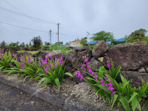 길가 돌담 옆에는 보랏빛 들꽃이, 또 한쪽에는 붉은 선인장꽃이 도보객을 반겨주고 있었다. 붉은 동백꽃도 아직 지지 않고 피어 있었다.
