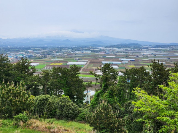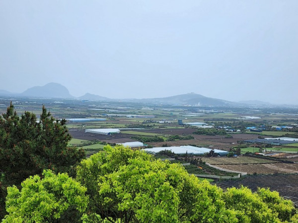 오름길 초입에 계단을 오르자 숲길이 나왔다. 완만한 숲길을 걸으니 전망대에 이르렀다. 녹남봉은 표고가 100m로 그리 높지 않지만, 전망대에 오르니 대정면 일대가 눈에 들어왔다. 멀리 산방산과 모슬봉도 비구름에 가려 희미하게 보였다.