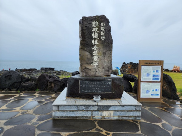 올레길은 해안으로 이어진다. 해안도로 한쪽에 『하멜 일행 남파희생자위령비』가 우뚝 서 있다. 1655년 하멜 일행이 승선한 페르레르호는 일본 나가사키로 항해하던 중 태풍을 만나 이곳 신도 2리 해안에 이르러 좌초되었다. 당시 승선자 중 목숨을 잃은 26명의 넋을 빌기 위해 마을 주민들이 2017년 위령비를 세웠다고 한다.