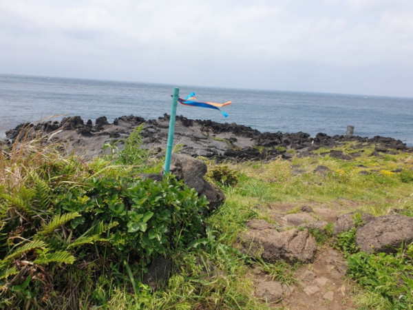 18코스 신촌 인근 해변에서 닭머루 정자를 바라보면서 맞주쳤던 풍경은 한순간에 나의 오감을 깨우쳐 주었다. 해안 절벽 길을 따라 들꽃이 피어있고 절벽 밑 바다에는 높지 않은 파도가 계속 밀려와 찰싹찰싹 소리를 냈다. 바다에서 해풍까지 불어와 특유의 짠 냄새까지 스며들어왔다. 한순간에 오감이 되살아나 내 몸을 일깨워주는 듯했다.